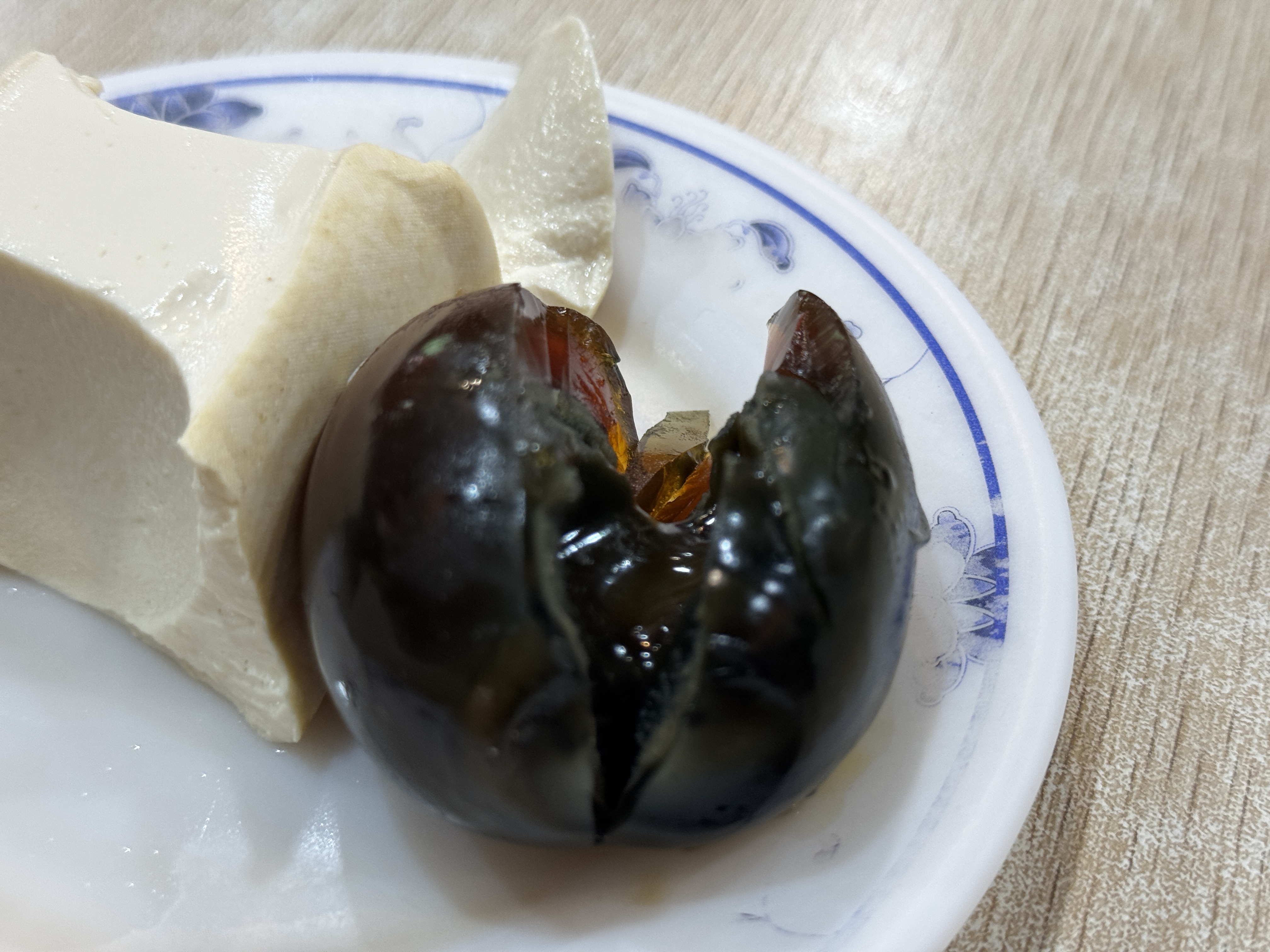 그리고 도전한 메뉴 하나. 바로 피단! 사실 아이랑 “저건 무슨 맛일까?” 이야기하다가, 용기 내서 주문했어요. 냄새 때문에 못 먹을 줄 알았는데, 의외로 괜찮더라고요. 노른자는 반숙처럼 고소했고, 흰자는 쫄깃한 젤리 같았어요. 다 먹지는 못했지만, 낯선 음식을 용기 내서 맛본 경험이 소중하게 느껴졌습니다.