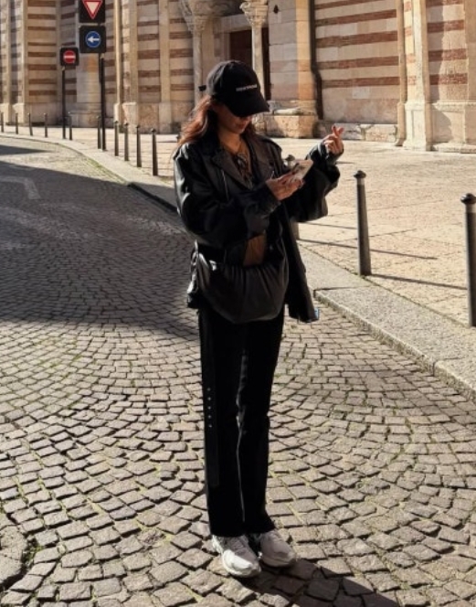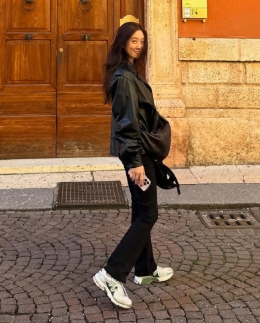 정려원 코디가 조금 다른 건 사복 기준으로 올라오는 사진들이 많다는 점이에요. 어머니와 산책하는 일상 사진, 여행 중에 찍힌 스냅 사진. 전문 촬영이 아닌 상황에서도 운동화 하나가 전체 분위기를 단정하게 잡아주는 방식이에요.
