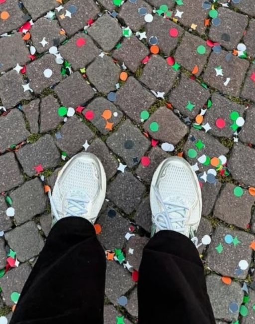 의상은 복잡하지 않고 신발이 조용히 포인트 역할을 하는 구성입니다.