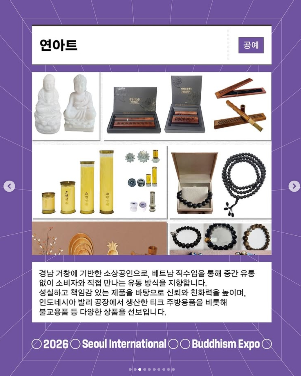 박람회 내에는 불교 미술과 현대 예술이 결합된 붓다아트페어가 함께 운영됩니다. 불교 전통 공예와 현대 아트 작품을 한자리에서 감상하고 구매할 수 있는 공간으로, 박람회 입장 티켓으로 함께 관람 가능합니다.