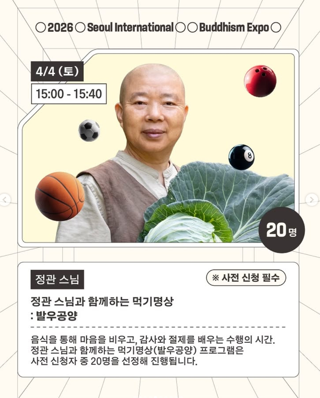 ⚠️ 정관 스님 먹기명상은 20명 한정 사전 신청 프로그램입니다. 3월 29일까지 신청이 마감되므로, 참여를 원하신다면 즉시 확인하시기 바랍니다.